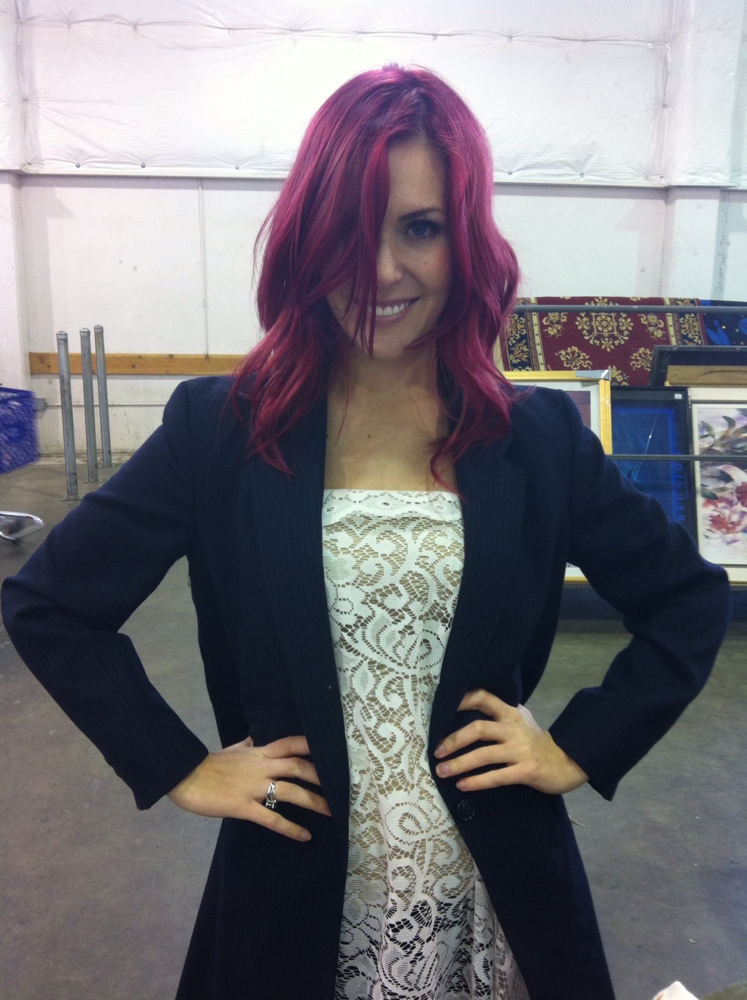 My finds were this long suit jacket and lace fabric. I think this belonged to the tallest, thinnest businessman in all the land. We agreed the fabric would be fun to make a little minidress out of and stick under this boxy, yet femme jacket.