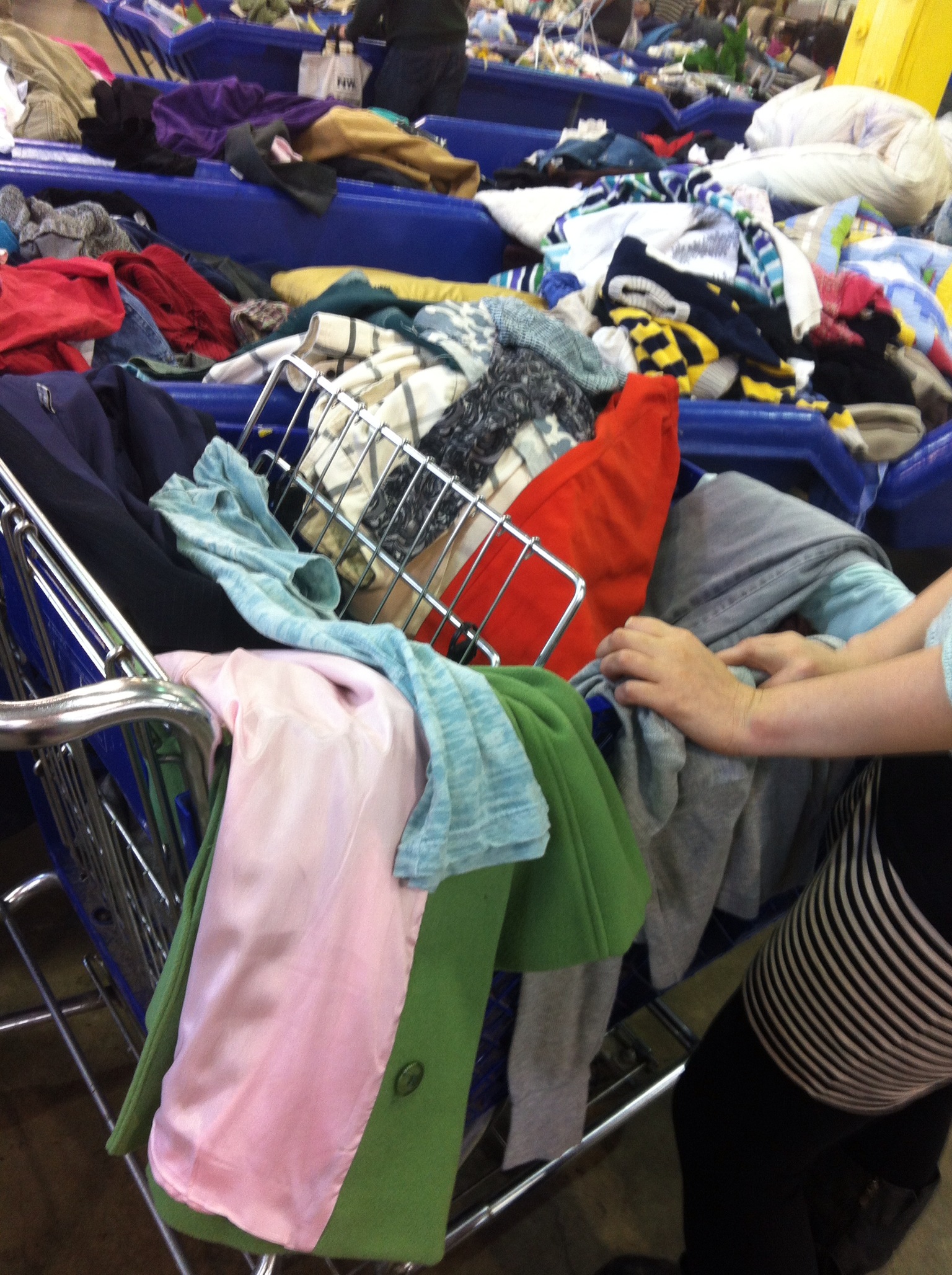 Tucked away, just off the highway, the outlet parking lot is full of Goodwill trucks. We snagged a parking spot, and proceeded inside to find ourselves inside the sliding doors, facing rows on rows of big bins that had mountains of clothing.